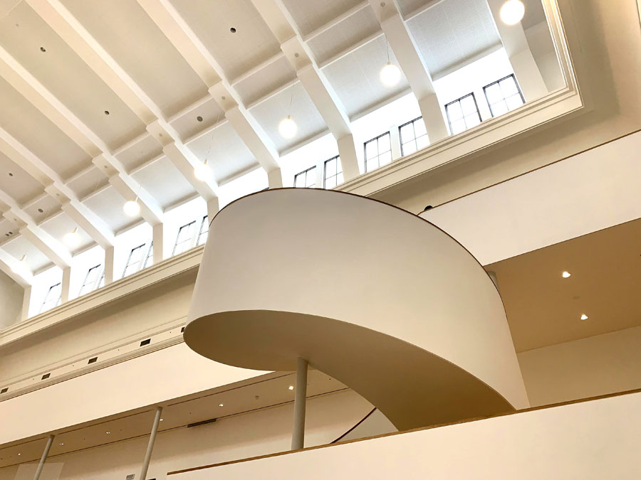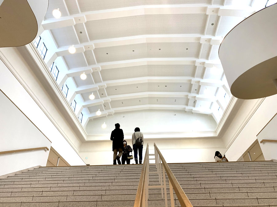 受付を済ませてチケットを受け取ったら、展示室へ向かうために階段をあがります。もとの建物にもあった白壁をいかした広々とした空間に、やわらかく日が差し込んでいます。