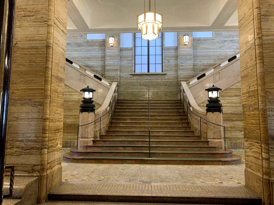 市民の方も利用できる展示室などがある2階へとつづく階段。クリーム色と薄茶の大理石が美しいですね。こちらもほぼ元のまま残されています。