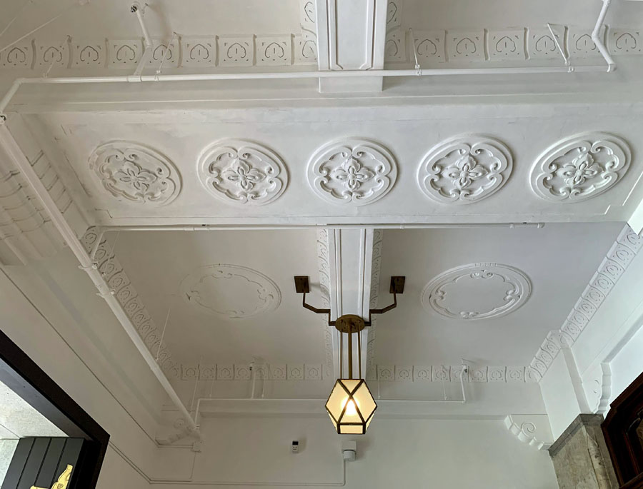 レリーフや大理石の階段など、手の込んだ内観はそのまま残っていました。京都市内でもこういった古い建築物はどんどん少なくなってきていますが、細かな部分まで凝った意匠がされて、レトロ建築が好きな方なら見飽きることがありません。