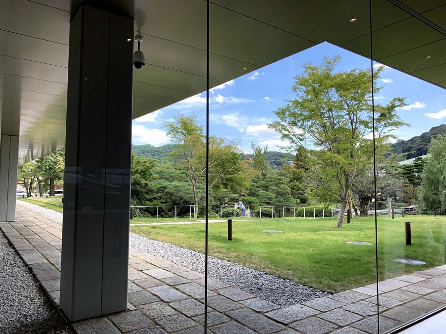 エントランスから日本庭園へのアプローチ部分です。この場所は元々、外にあった部分ですが、周りにガラス窓を設けることで建物の中に取り込まれる形になっています。