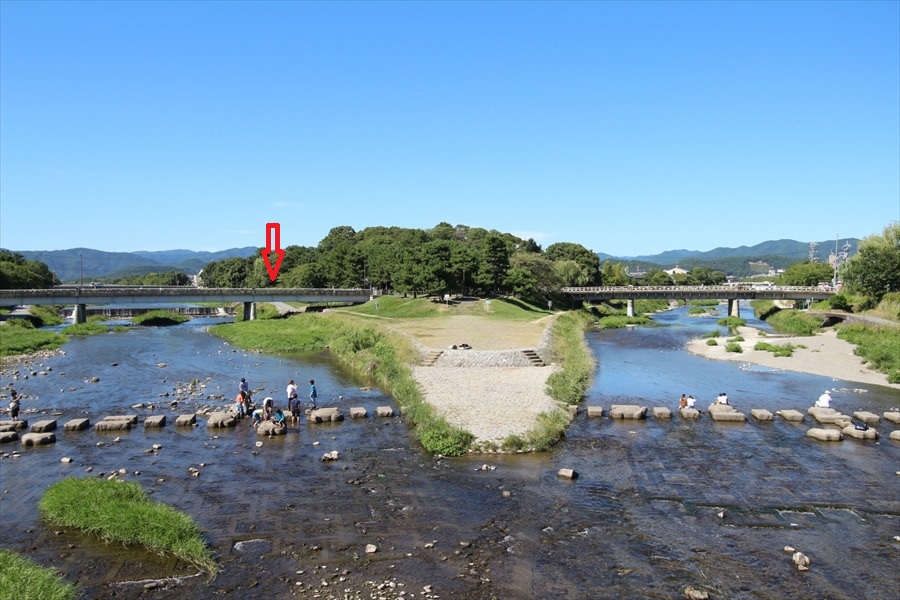 上の写真の矢印で指している場所をスタートにしてください。真ん中の森が下鴨神社です。写真の右は高野川、高野川の河川敷におりて進んでしまうと大変!永遠に上賀茂神社には到着できなくなります(>_<)