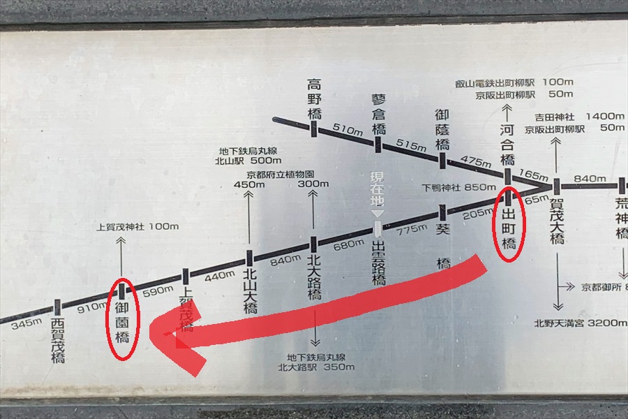 上賀茂神社まで河川敷をサイクリングする途中では、何度も橋の下をくぐります。スタート地点の出町橋を出発してから、6つ目の橋・御園橋(みそのばし)がゴールになります。河川敷に案内プレートが設置されていますので、自分が今どこにいるかも確認できるようになっています。