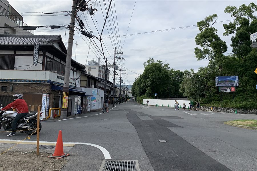 自転車を借りたら橋を渡り下鴨神社の参道に入りましょう。参道をまっすぐ進むと途中で、写真のような通行止めがありますが、気にせず進んで大丈夫です。参道を歩いている人も多いので、スピードはゆっくりで!