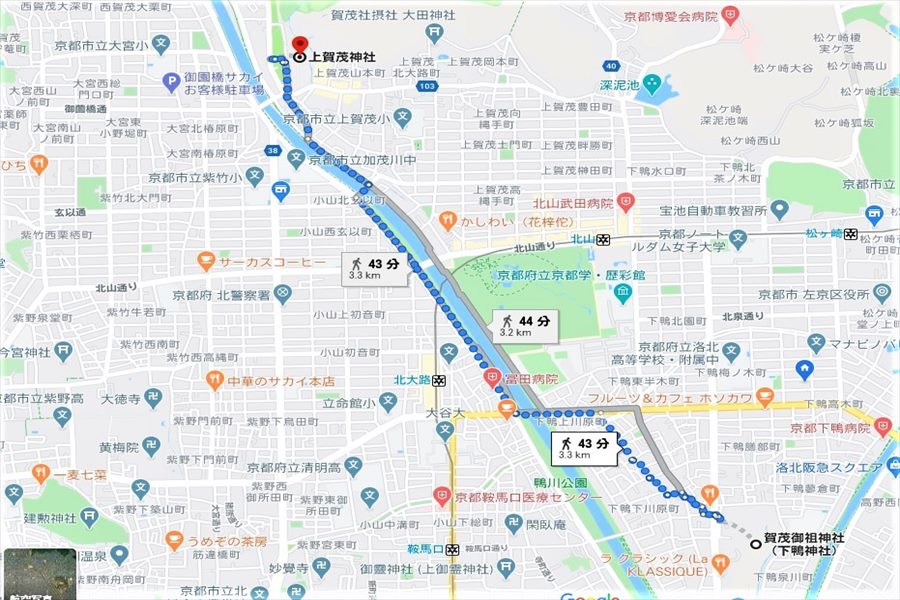 下鴨神社と上賀茂神社の間の距離は約3.3㎞。ゆっくりサイクリングでも約30分、歩いて移動しても約50分です。
