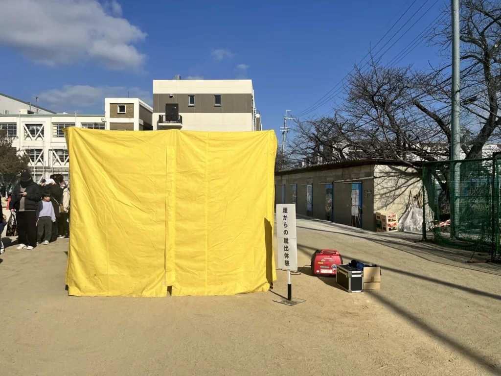 ベビーカーのまま参加できる濃煙体験では、視界がほとんど見えずびっくり…。