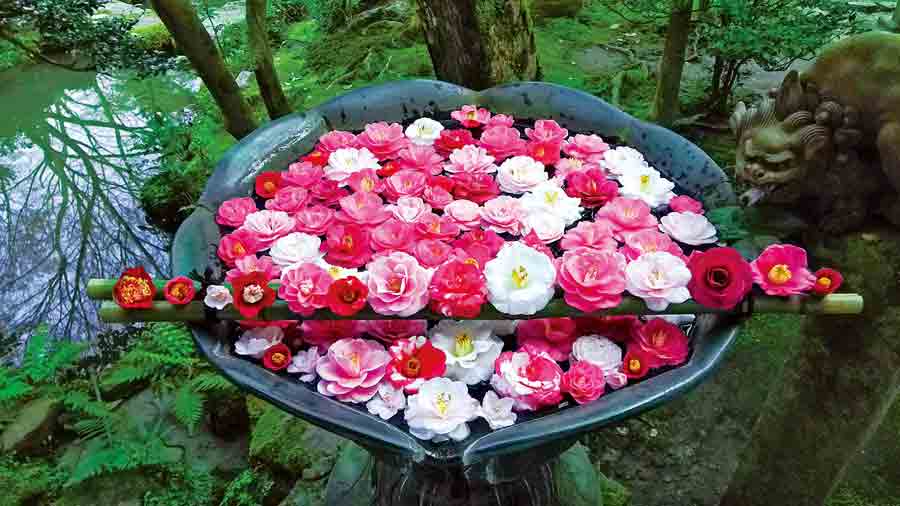 中庭に配された色鮮やかな椿の手水鉢もきれい!