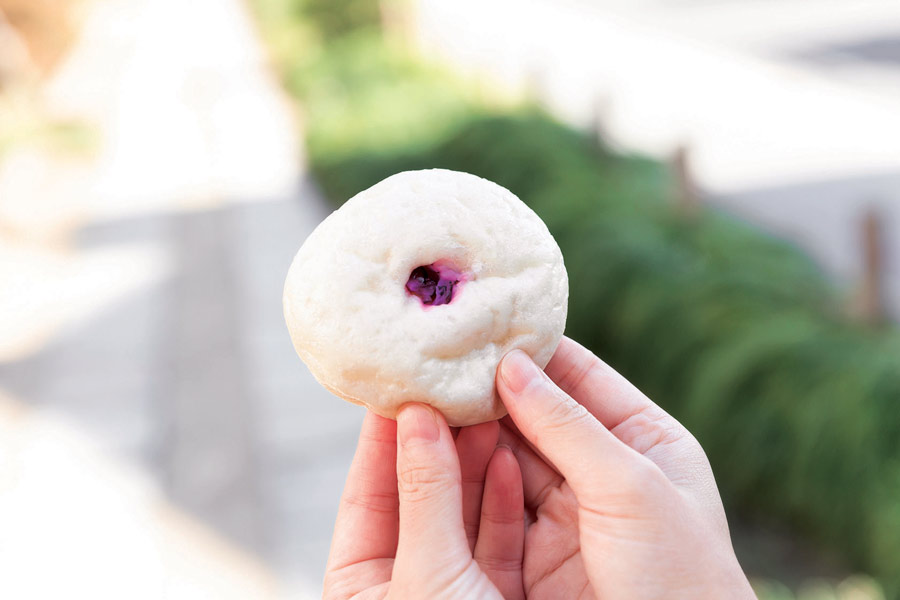 散策の始まりは、銀閣寺の門前から。 和の雰囲気を醸し出す「ぱんや 松」に入ると、あれもこれもと手を伸ばしたくなるパンがバラエティー豊かに勢ぞろい。抹茶入りのマーブル生地に、小豆を混ぜ込んだ「大文字」も人気。