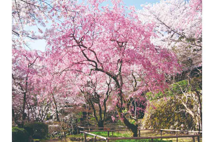 動物や鳥に見立てた石が並ぶ「鳥獣の庭」に、 シダレザクラが凛(りん)と立つ姿が美しいスポット。