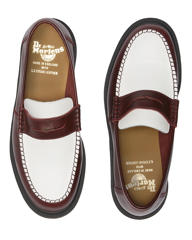 Charles F. Stead社製の品質の高いバーガンディカラーのクラシックカーフレザーとドクターマーチン特融のホワイトスムースレザーのミックスで上品でモダンなクラシックスタイルを楽しめるローファーです。