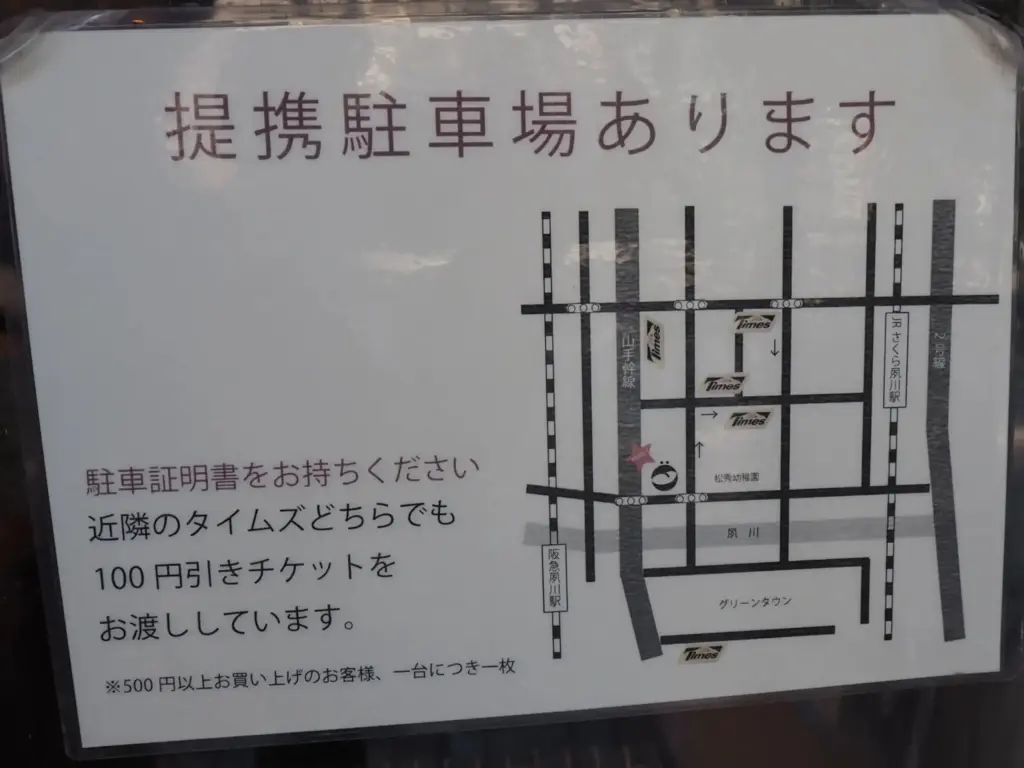 コンセントマーケット(CONCENT MARKET)へのアクセスは、阪急夙川駅から徒歩3分です。阪急夙川駅南改札を出てロータリーに沿って左に進み、橋を渡って右折方向に道を渡るとすぐ、階段とスロープがあります。どちらで降りても、すぐ左手にお店があります。正面入口に看板がないのですが、右手の角にフラッグ看板が出ていますので探してみてください。提携駐車場があるそうです。