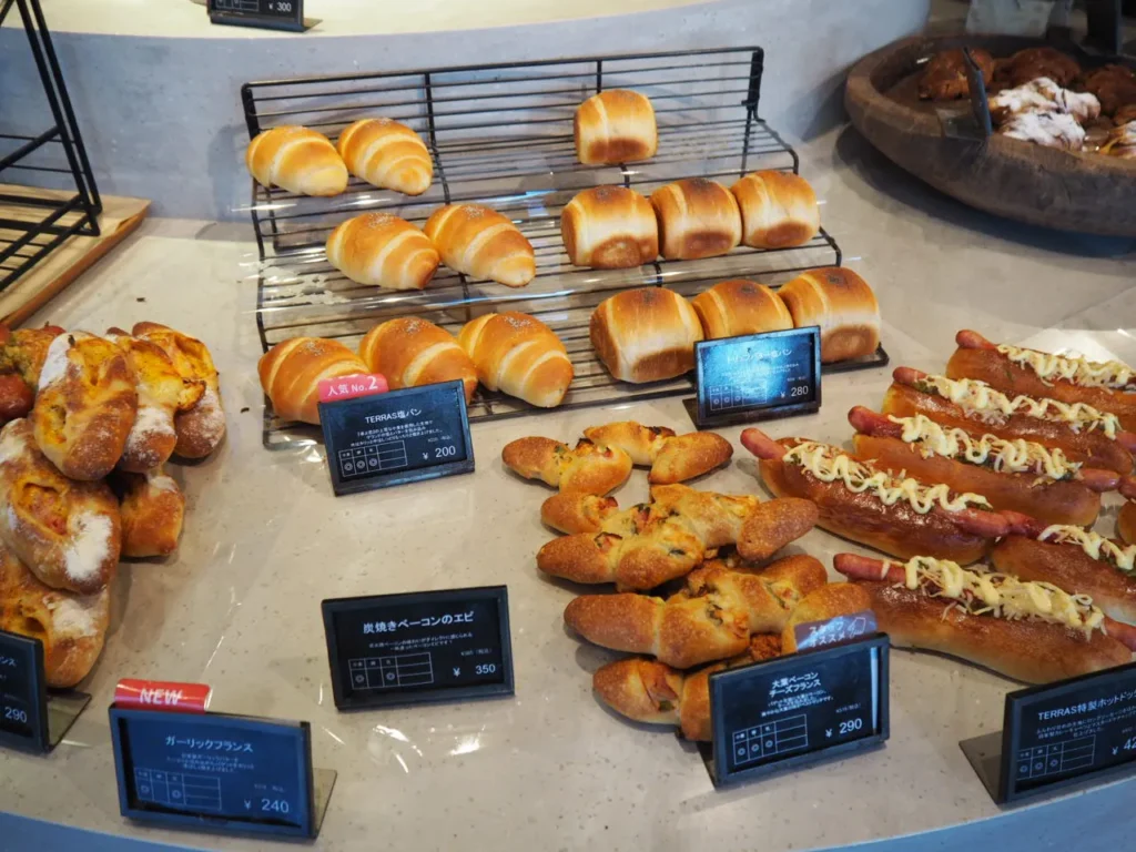 テラスベーカリー&カフェ(TERRAS Bakery&Cafe)は、毎日の暮らしのアクセントになるおしゃれな、地元の方を中心に愛されるベーカリーカフェです。和食の職人、イタリアンの職人、野菜作りの職人。お菓子作りの職人。そしてもちろん、パン作りの職人など、いろんなジャンルの職人の技がパン作りに集結し、毎日丁寧に焼き上げています。
