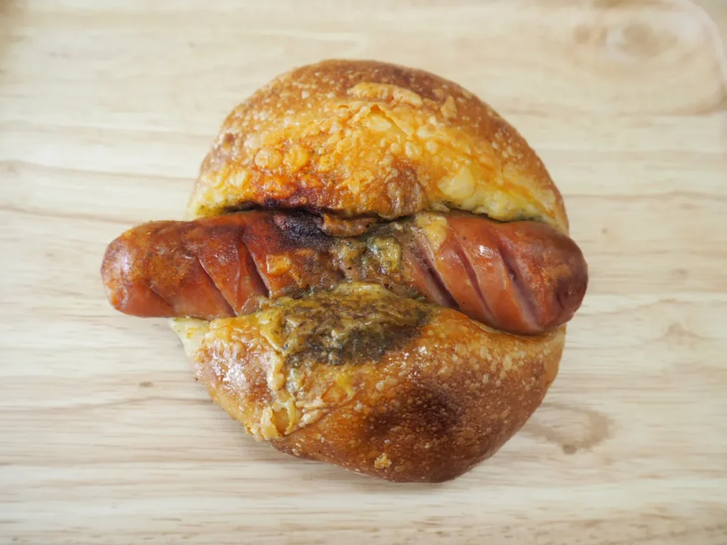 特徴: ハードな生地に大きなポークソーセージが挟まったこちら。バジルの風味が全体のバランスを整えてくれていて、大人向けの味わいです。