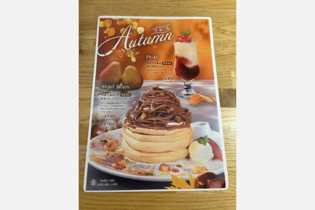 阪急電車岡本駅、南改札口からすぐのところにある、パンケーキ専門店「belle-ville pancake cafe 阪急岡本駅店」。秋のシーズナブルメニュー「洋梨と栗の秋色モンブランパンケーキ」が登場していると聞いて、食べに行ってみました。