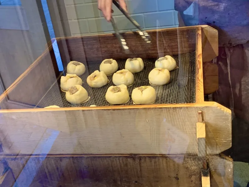 お店の奥では職人さんたちが肉包焼売を包んでいる姿が見られます。タイミングよく、蒸しているところをキャッチしましたよ!普段の食卓で目にしている焼売にしては大きくて、肉まんにしては小ぶりのように見えます。たくさん並んだ肉包焼売たちからほかほかの湯気が!