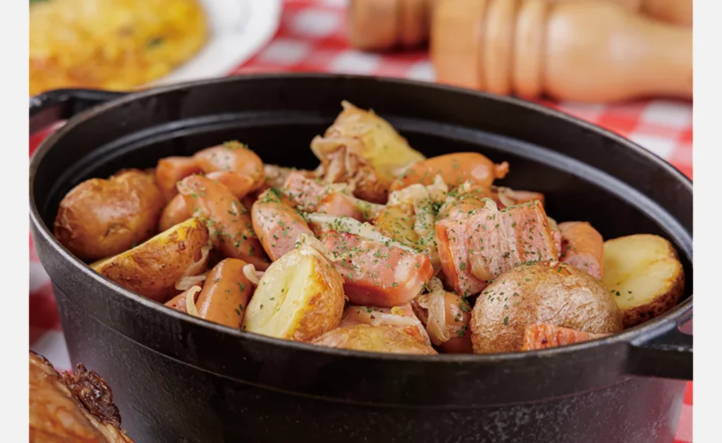 ドイツの「ジャーマンポテト」はじゃがいもとソーセージの定番の組み合わせに自家製ベーコンをプラスしてワンランクアップの味わいに。