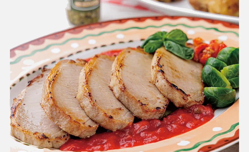 イタリアの「ポークソテー」は、トマトピューレ・アンチョビ・ガーリック・オリーブオイルなどで作ったソース“プッタネスカ”を合わせて提供されます。