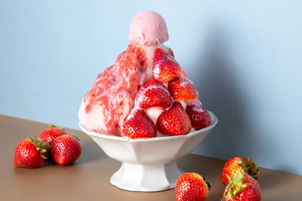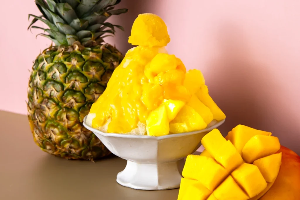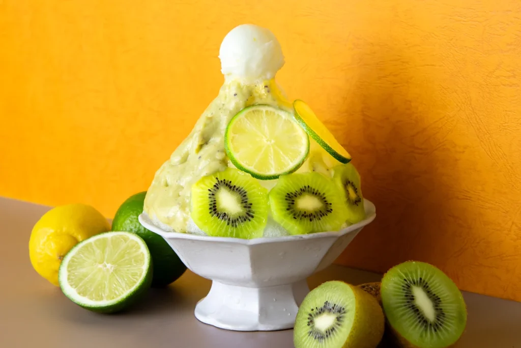 かき氷はどっさりフルーツ、てっぺんにはフレーバーのアイスが乗り、ふわふわシェーブドアイスの中にはミルクプリンも入った、満足度◎な「イチゴ✕ミルク」「マンゴー✕パイン」「キウイ✕ライム」の3種です。