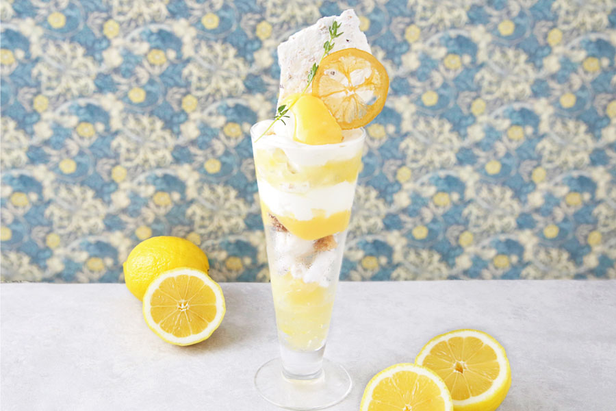 お店でじっくり炊き上げた自家製レモンカードにジャスミンのクリーム。 ザクザク食感のカルダモンクランブルがアクセント。 最後はきゅっと酸味のあるレモンジュレで、 食べるごとに変化のあるさっぱりとしたパルフェ。