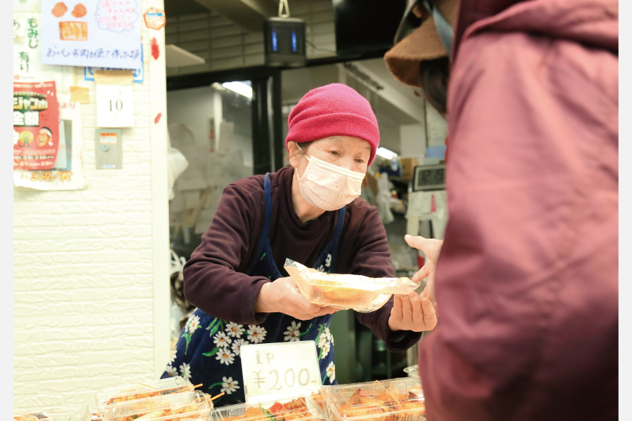 「まいど!」「今日は早いね」「いつもありがとう!」。お客さんが訪れるたびに、威勢のいい声が響き渡る。「家でじっとしているよりお店に出ていたい。接客が大好き」と話すのは、「鳥舟」の顔として店番を務める岡﨑千栄子さん。1972年に夫婦で大安亭市場内に店舗を借り、4坪のスペースから商売を始めて早50年。今では従業員の数も大幅に増え、調理場まで備える立派なお店に成長した。