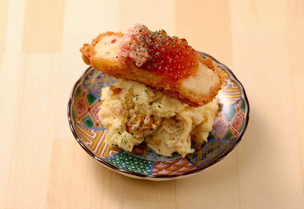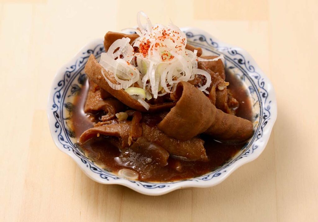 こだわりは鶏出汁ベースのあっさりとした変わり種おでん。グラスの縁ギリギリまで注がれた(というか溢れてる)赤ワインとの相性もばっちり!また、王道の八丁味噌使用の野菜たっぷり自家製『もつ煮』は、絶妙なコクのある旨みが凝縮されてお酒が止まらない逸品に。