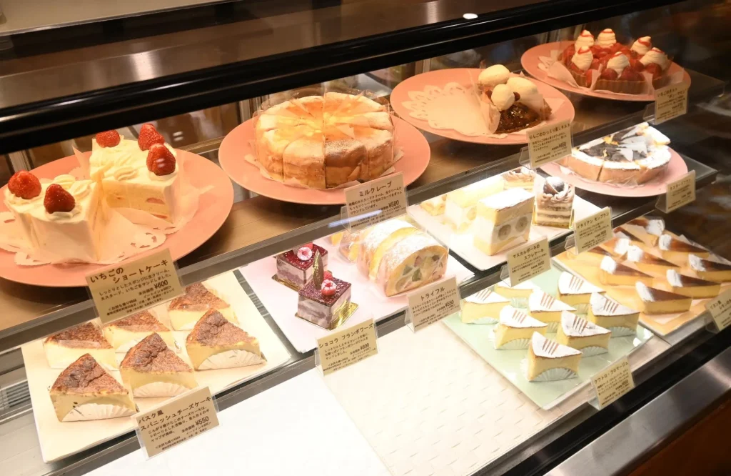 店に入って右手奥の一角は、パティスリーのコーナー。冷蔵ショーケースには、10種類前後のケーキ。棚には焼菓子、自家製ジャムなどが並んでいる。