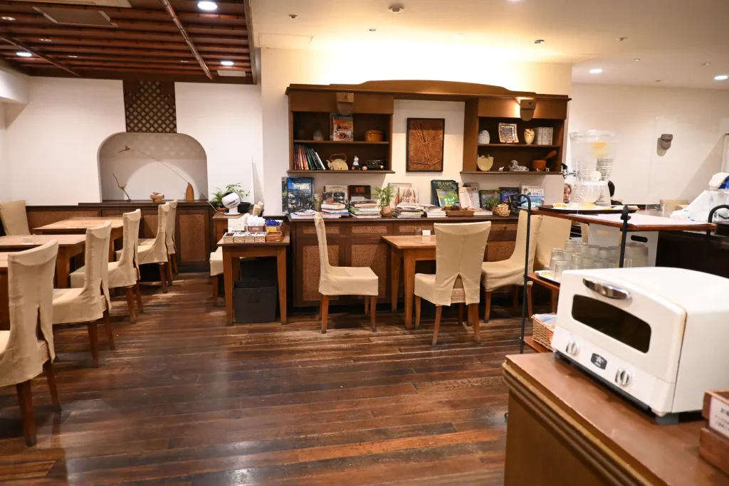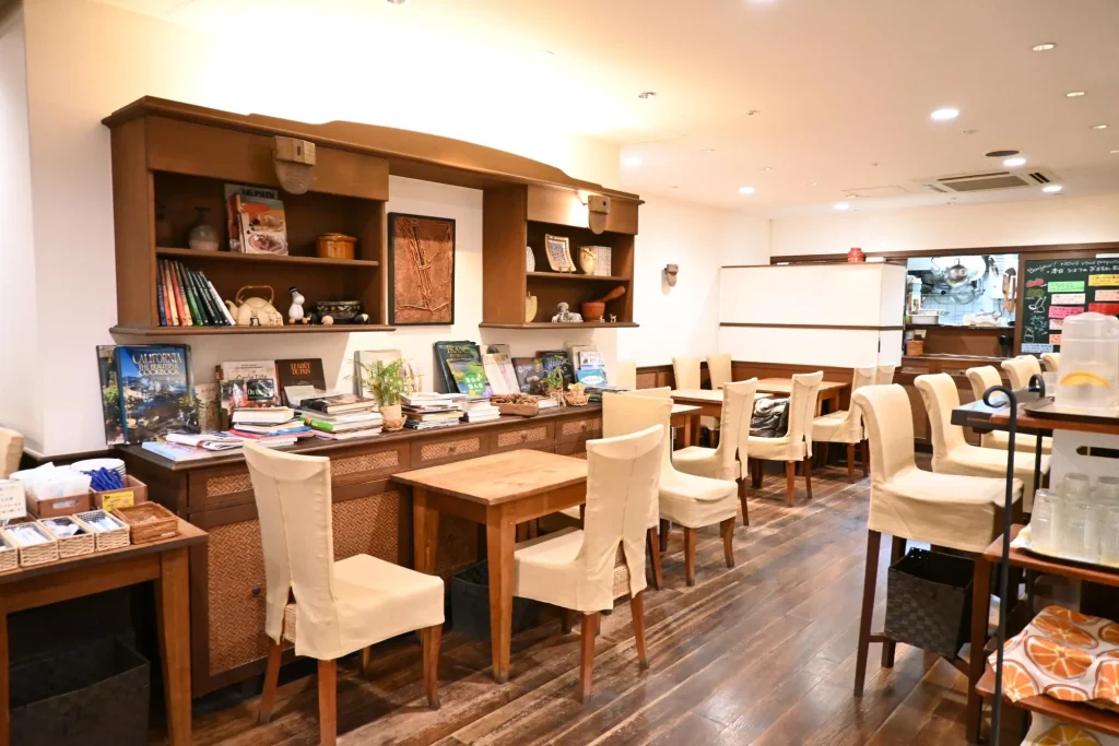 パティスリーコーナーのさらに奥にある30席ほどのスペースが「オネストカフェ」。モーニング、ランチ、カフェ、少し早めのディナーと、様々なシチュエーションで利用できる。