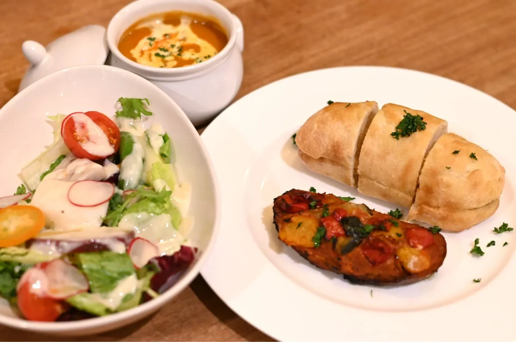 さらに、野菜のうまみが凝縮された8品目野菜のポタージュスープと、新鮮野菜がダイナミックにカットされた彩り美しいサラダがつく。豆腐とユズのとろりとしたドレッシングも、もちろんお店のオリジナル。