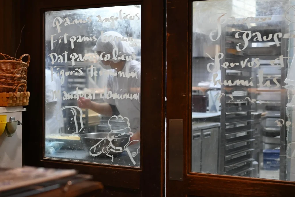 ガラス一面にフランス語が手書きされたおしゃれな扉を開けると、パンがずらり。ハード系や調理パン、菓子パン、サンドウィッチなどパンは合わせて50種類を超える。