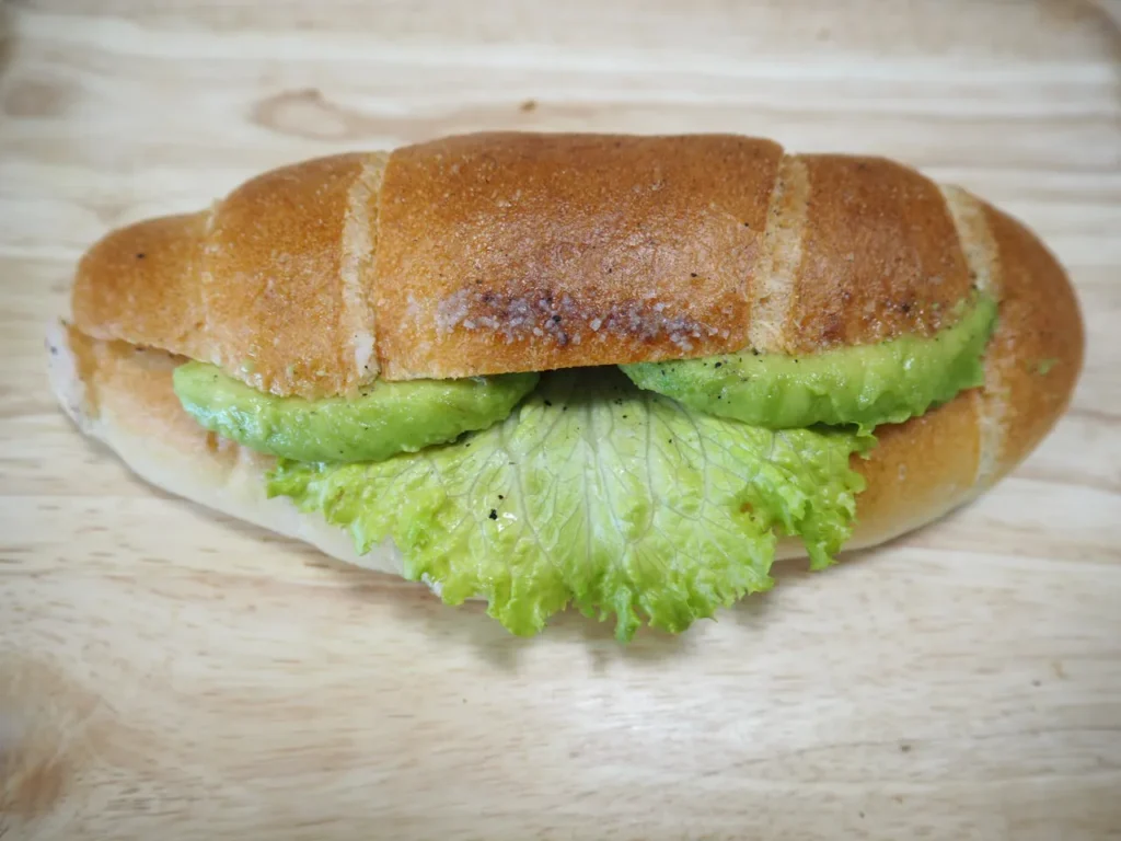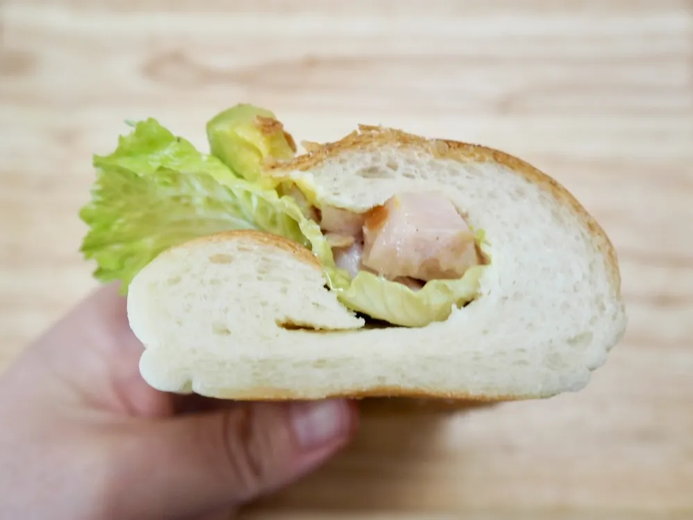 特徴: ソフトめのパンにスモークされた鶏ムネ肉とアボカドがサンドされた、さっぱりおいしい一品。
