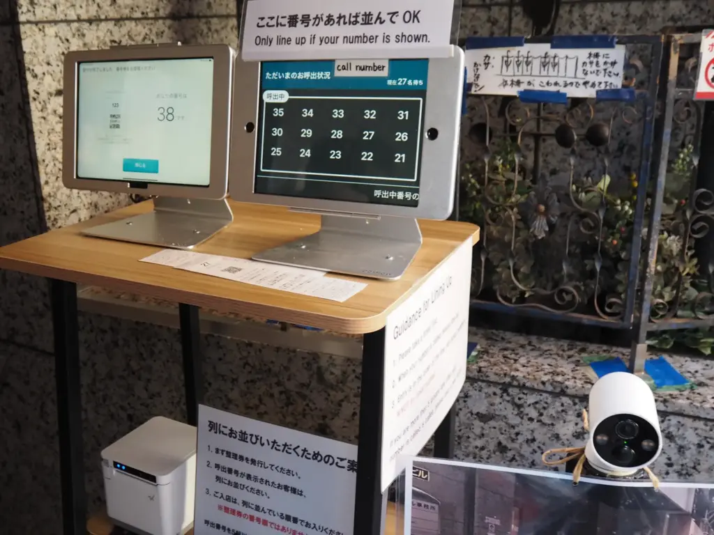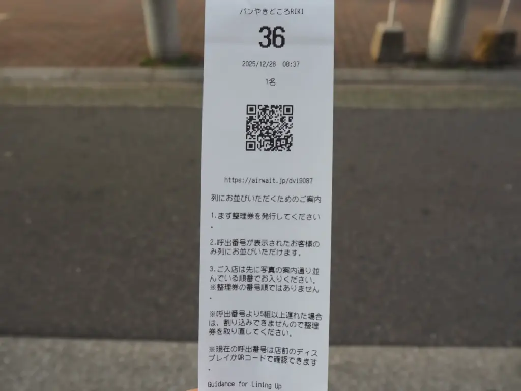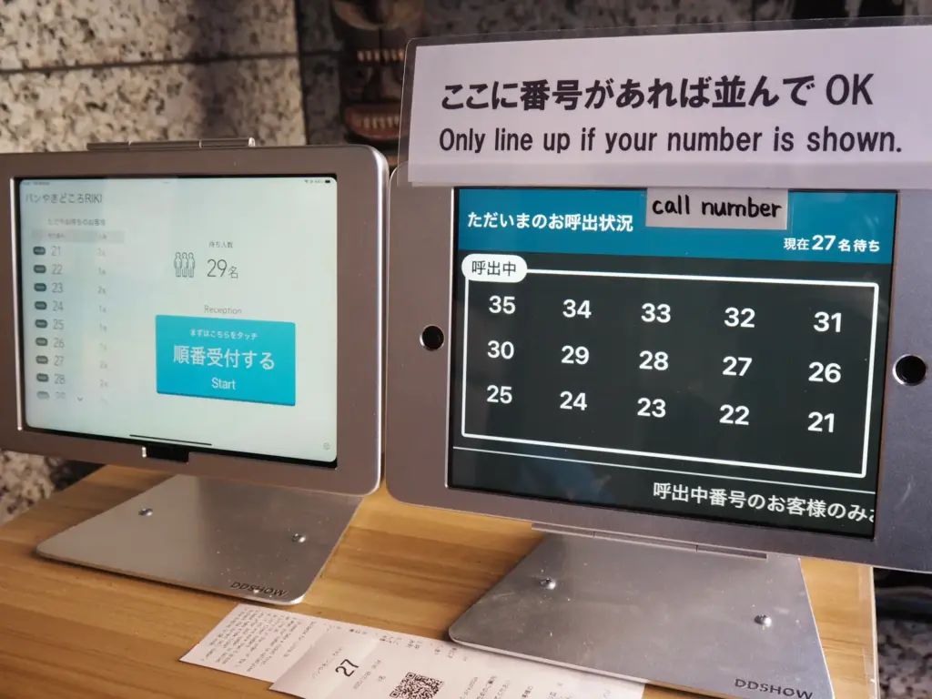 パン焼きどころRIKIは整理券方式で入る店内は狭く、6名ほどしか入れません。スタッフの案内に従って入店しましょう。店外にはスタッフが居ないので、着いたらまず発券機で、人数を入力して整理券を発券してください。「順番受付する」をタップして入店人数を選択したら完了です。ここで大事ポイント。入店するのは整理券番号順ではないので、発券したらすぐ並びます。並ぶのが送れると整理券番号が後の人が先に入店することになりますのでご注意ください。店前の敷地内には整理券番号がモニターに表示された8名までが並び、残りは歩道沿いに並んでいきます。整理券は入店時に提示して会計の時に回収されるので、なくさないようにしてくださいね。