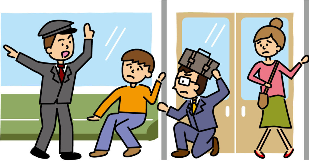 大きな地震や災害が起きた場合、公共交通機関が動かなくなることを想定しておこう。一度は会社や学校から徒歩で歩いて帰る練習を。災害の際に車内にいた場合は、乗務員やスタッフの指示に従い、勝手に降りるなどの行動はしないで。