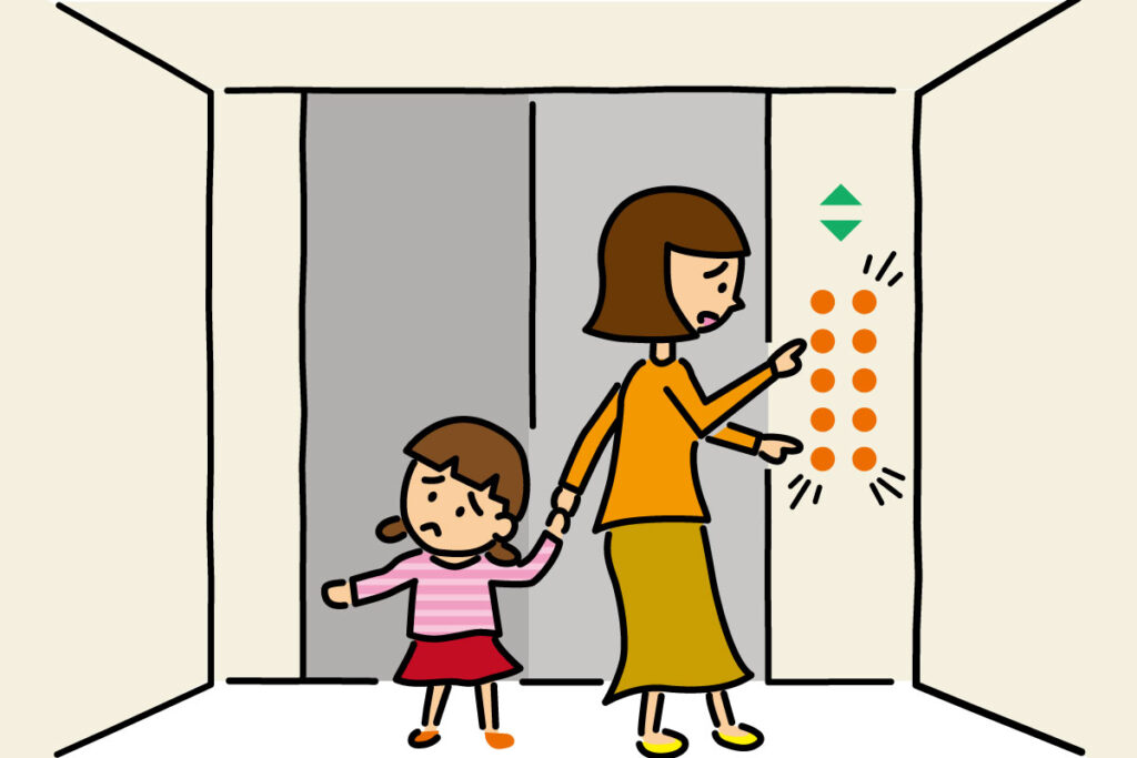 揺れを感じたら全ての行先階のボタンを押し、最初に止まった階で降りること。止まってしまった場合は外部との連絡手段であるインターホンで状況を伝え、救助が到着するまで待つこと。無理矢理外に出るのは危険。