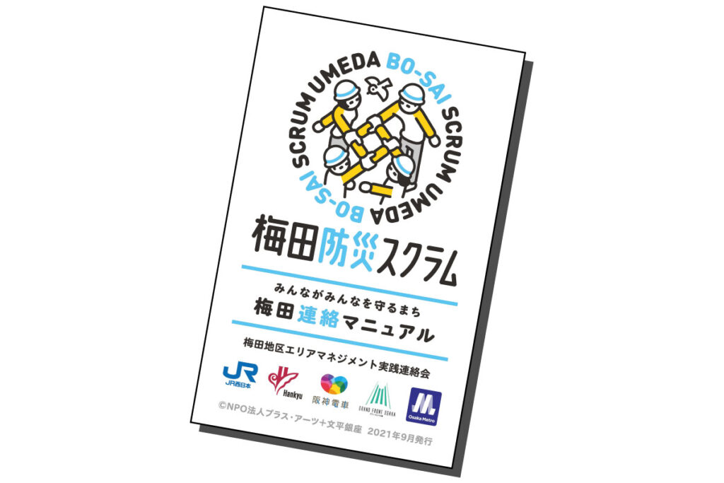 地下にも地上にも街が広がる梅田エリア。もしも梅田で災害に遭ったら? そんな時にどうすればよいかを防災マニュアルやサイネージ、SNSなどで情報発信を行うのが「梅田防災スクラム」。梅田地区の人と人、企業と企業、エリアとエリアがスクラムを組むように、がっちりと手を組み協力しながら「梅田で働く人、梅田を訪れる人同士が助け合えるエリア」を目指している。「携帯型防災マニュアルブック」は下記からダウンロードを。