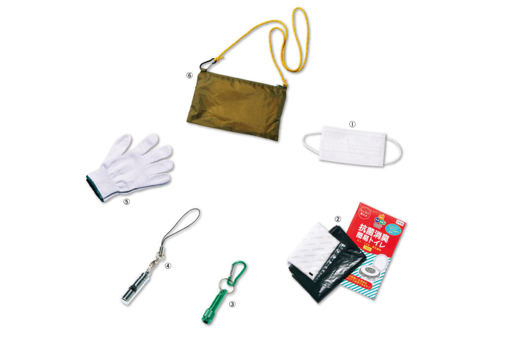人と防災未来センターが独自の基準で選定、携帯を推奨しているアイテム。ポーチなどにまとめて持ち歩くか、普段のバッグに分散して入れておくのでもOK。