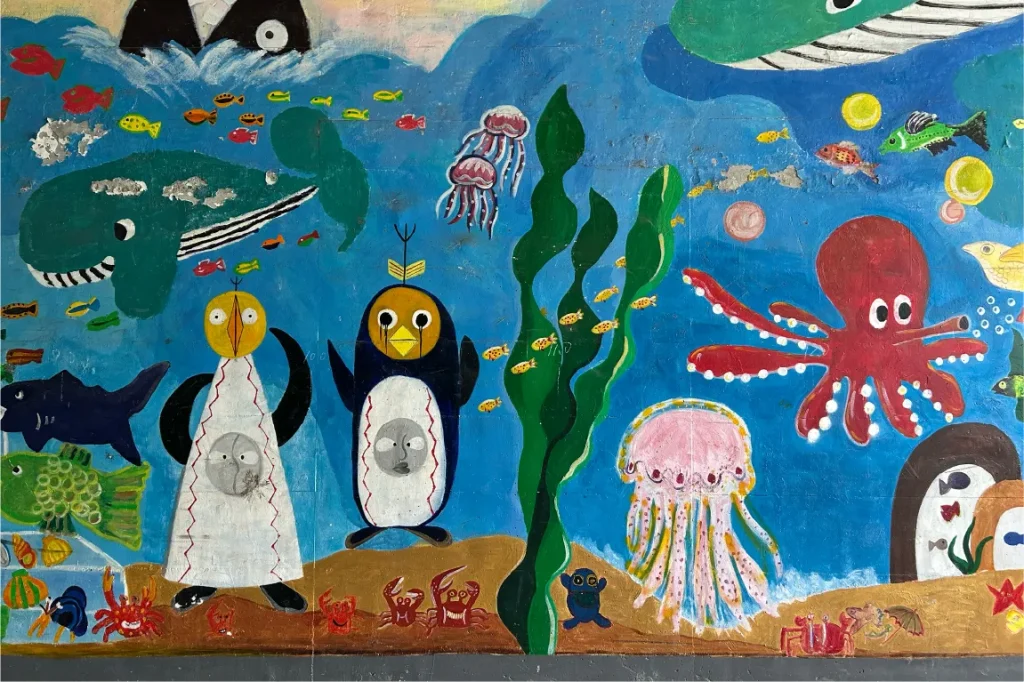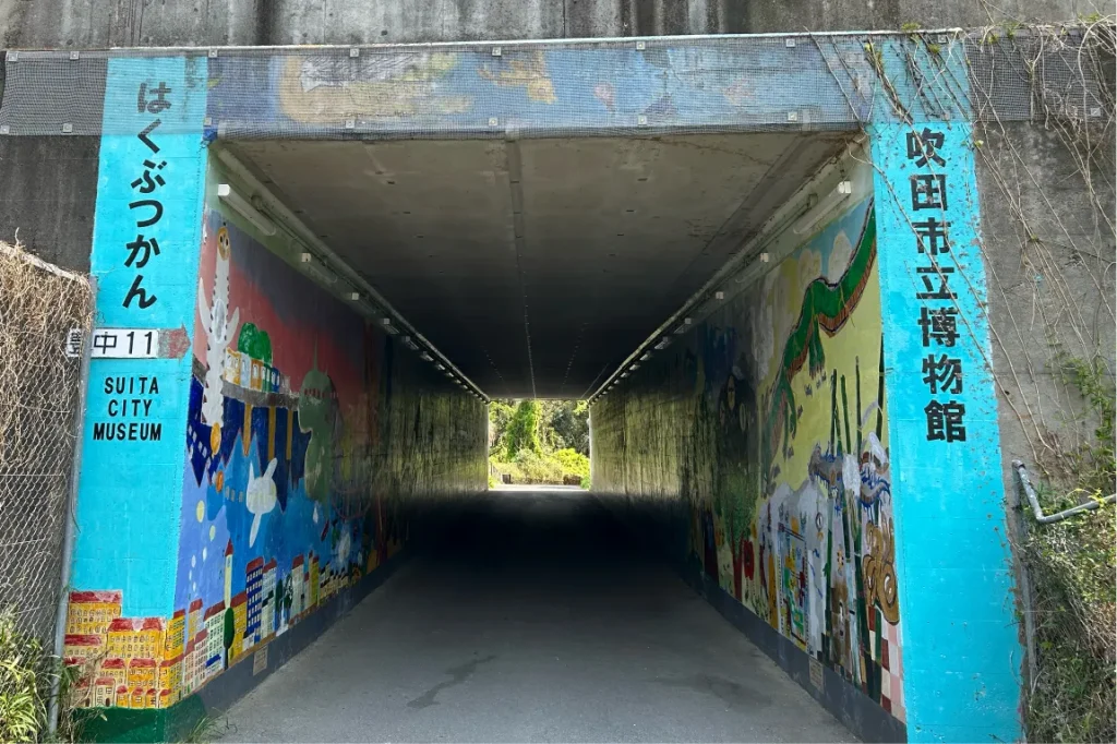 ところでこの「吹田市立博物館」は、8.4haもの広大な「紫金山公園」の中にあるミュージアムです。公園の緑を楽しみながら、博物館への看板を頼りに向かうと、現れたのは何ともかわいいトンネル!これは、2006年から3年かけて子どもたちの原画をもとにアーティストや子どもたち自身が描いたトンネルアートだそう。このトンネルを抜けると「吹田市立博物館」に到着します。