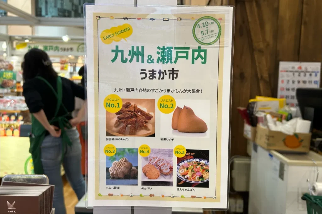 定期的にさまざまなイベントを開催する「ハンズ江坂店」の1階イベントホール。5月7日(水)までは、地元で愛される九州・瀬戸内各地の名産品がズラリとそろった「九州&瀬戸内うまか市」が開催中です。