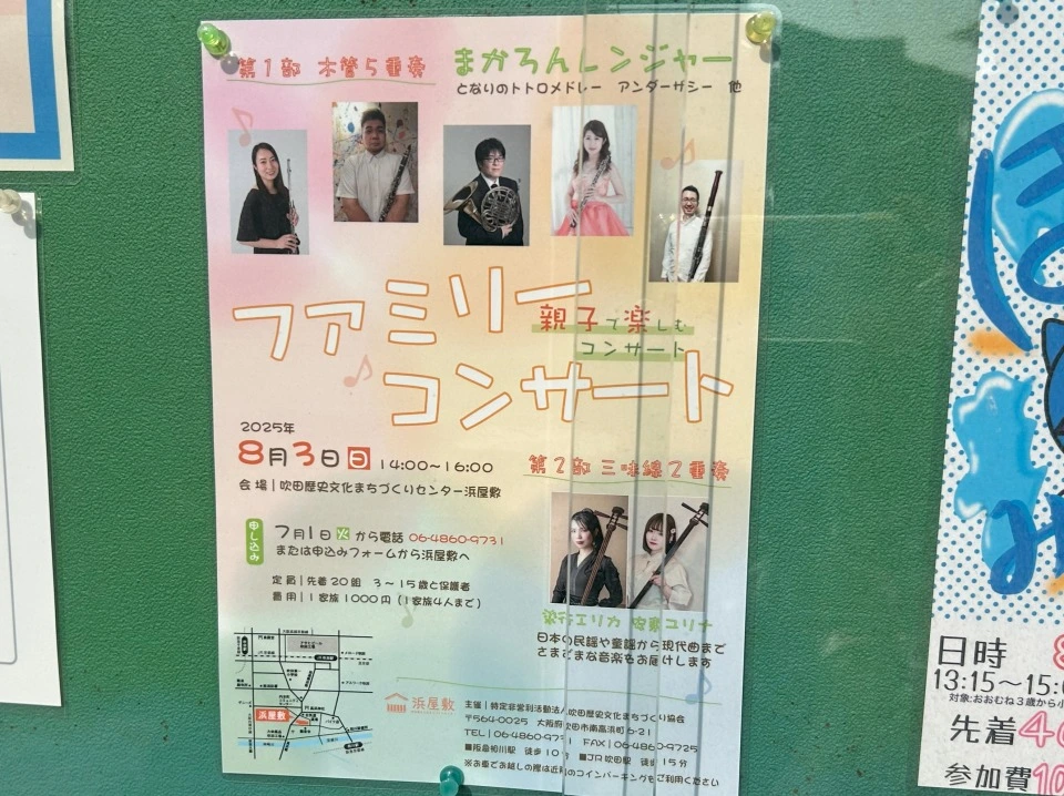 8月3日(日)に「吹田歴史文化まちづくりセンター 浜屋敷」で行われる「親子で楽しむコンサート ファミリーコンサート」の受付が、7月1日(火)9時から始まります。