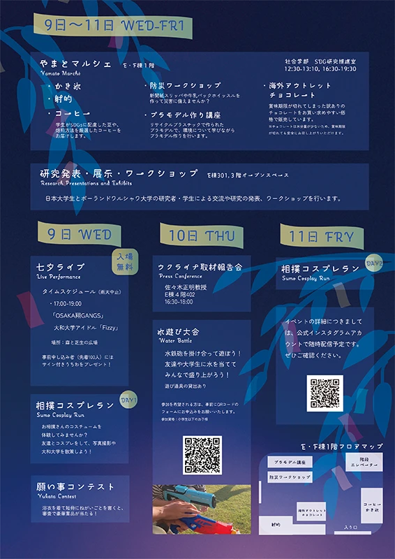 大和大学では、7月9日(水)~11日(金)に「七夕フェスタ」が一般公開で開催されます。9日にはポーランドのワルシャワ大学の研究者らが訪れ、大阪・関西万博の開催にちなんで「サステナブル(持続可能性)」をテーマにしたシンポジウムを開催。アイドルの野外ステージやSDGsにかかわるマルシェなども開かれます。入場は無料です。