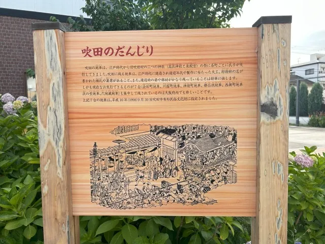 吹田に残る地車(だんじり)は、旧吹田村の高浜神社と泉殿宮の祭で各町ごとに氏子が曳航してきました。建造時の姿や部材がかなり残り、今でも曳行できるだんじりが7台もあることは大阪府内でも珍しいそうです。いずれも1998年9月に吹田市有形民俗文化財に指定されました。