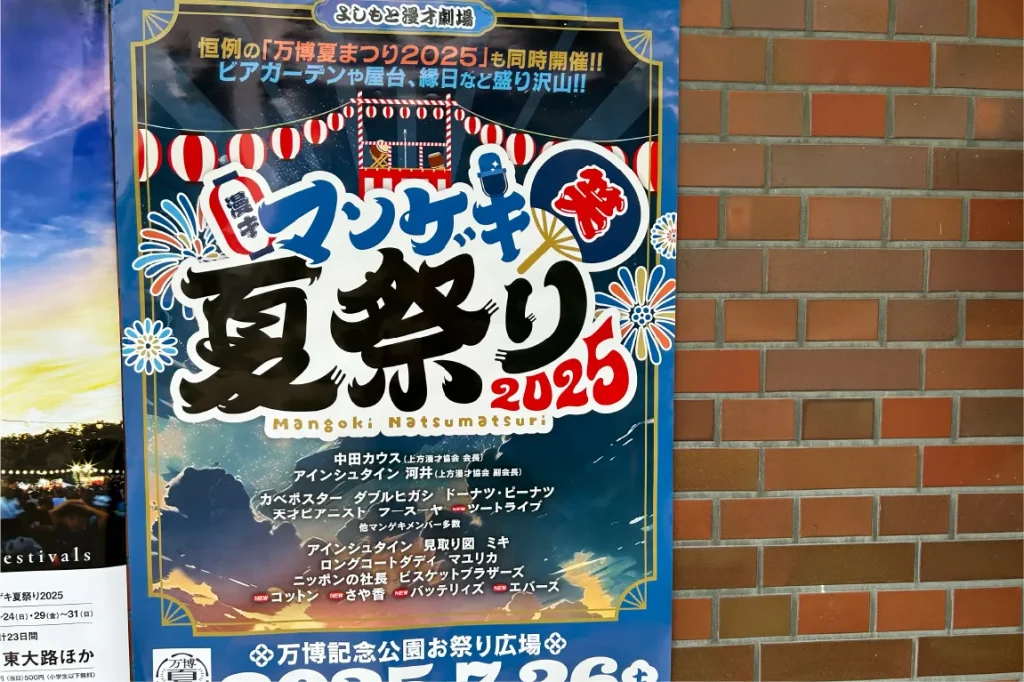 加えて、7月26日(土)は「万博夜市 with ビアガーデン」は休みとなり、お祭り広場にて「マンゲキ夏祭り2025」を開催します。ダブルヒガシやニッポンの社長など、人気芸人たちが多数集うイベントとあって、こちらも見逃せません!