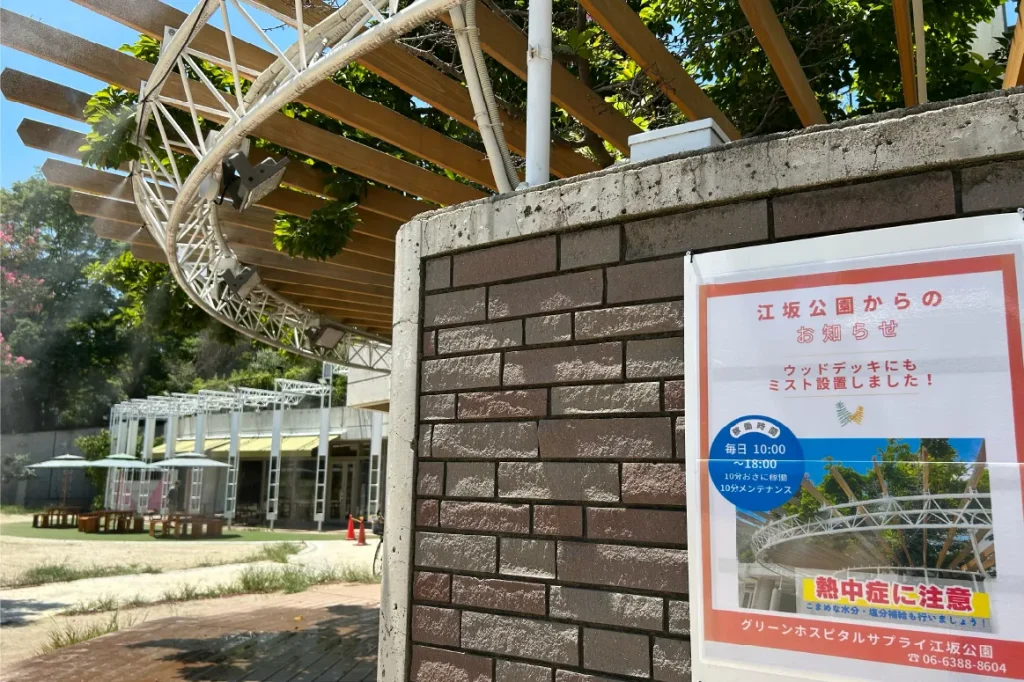 毎日暑い日が続きますが、「江坂公園」はいつもにぎわいが絶えません。熱中症には気を付けて過ごしたいものですが、公園東側の「つどいの広場」にあるウッドデッキでは、涼やかなミストシャワーが稼働中!
