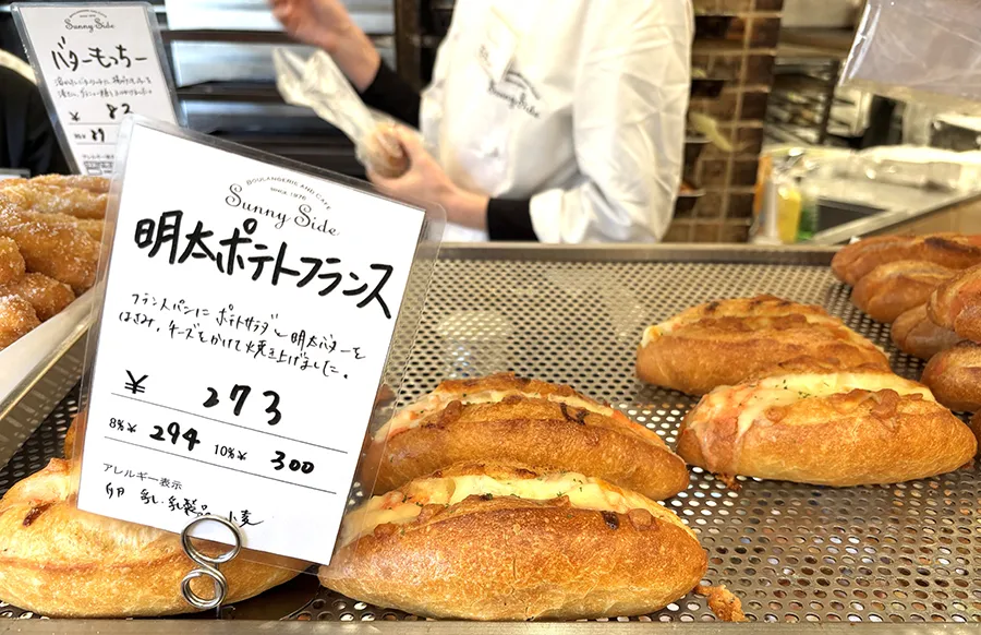 畠田さんをはじめ「サニーサイド吹田南千里本店」のスタッフからもおすすめと名前が挙がる「明太ポテトフランス」は、「あらびきウインナー」と双璧をなす定番の人気調理パン。特に「サニーサイド」ご自慢のフランスパンに、ポテトサラダと明太バターをはさみ、チーズをかけて焼き上げた、食べる前から絶対美味しいと確信できるパンが「明太ポテトフランス」!