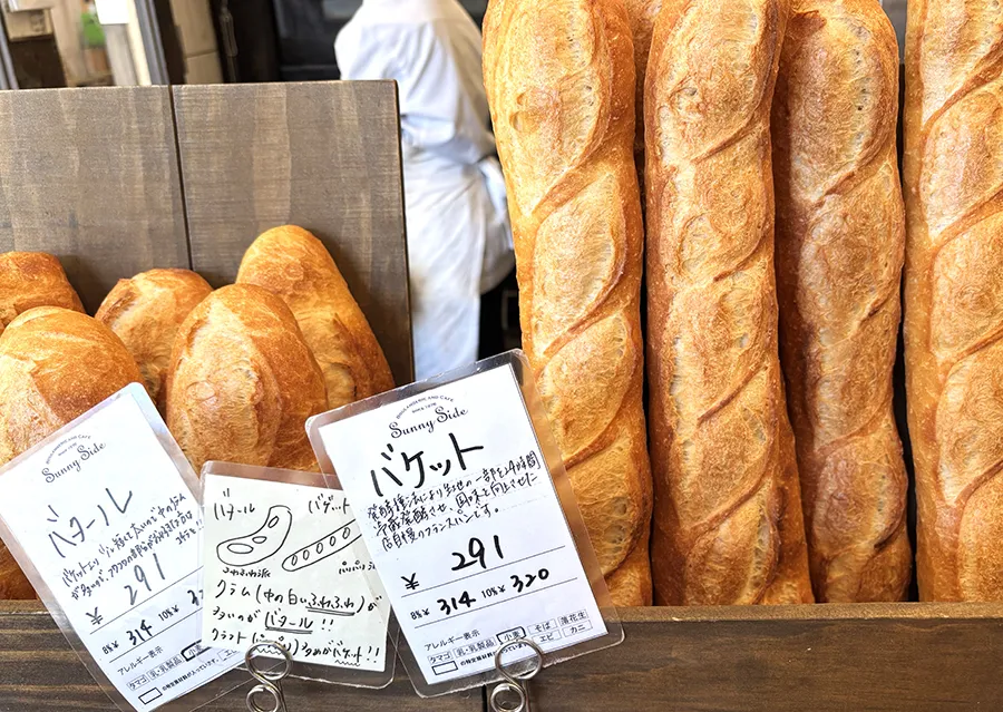 「サニーサイド吹田南千里本店」のバゲットは、生地の一部を24時間冷蔵発酵させ、風味を向上させた「サニーサイド」自慢のフランスパン。「サニーサイド」の様々な調理パンにも使われている万能な一品だ。