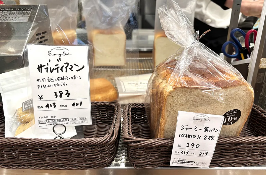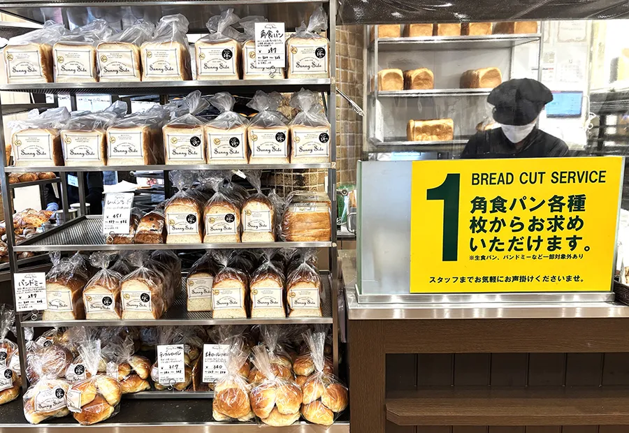 続いてパン屋さんではよくあるサービスだが「サニーサイド吹田南千里本店」でももちろん実施しているのが、スライスオーダー。角食パン類は、1枚からスライスオーダーができるカットサービスも(生食パン・パンドミーなど一部商品は除外)。