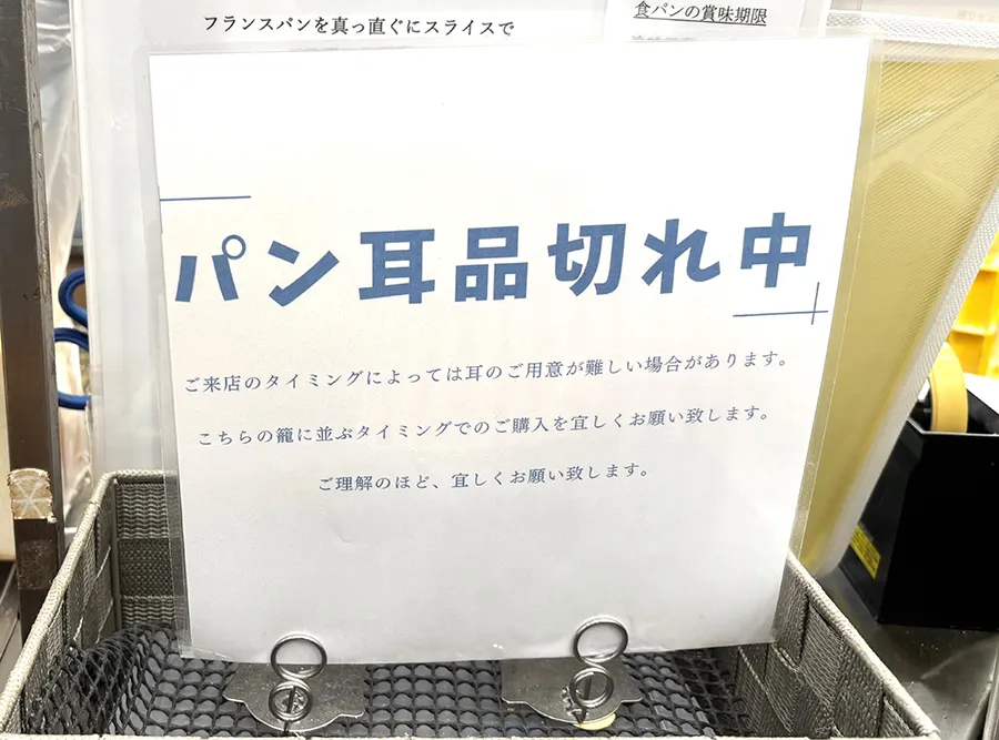 なお、この陳列棚横には「パン耳」が並んでいることも。取材時は、品切れのため「パン耳品切れ中」と立札があるだけだったが、もし見かけたらぜひ手に入れたい品。