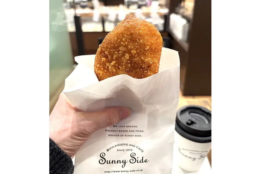 ひとくち齧ると、揚げたてアツアツのカレーパンがまとうカリカリの衣と、もちっとした生地! カレーのフィリングに到達していないのに、これだけで充分美味しい時点で「サニーサイド」のすごさが!