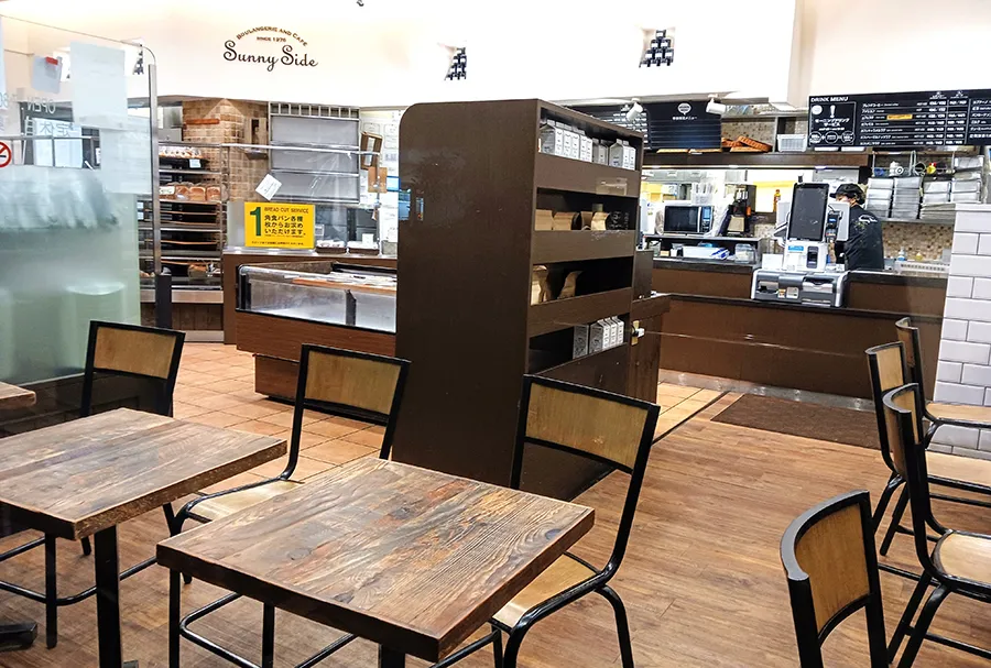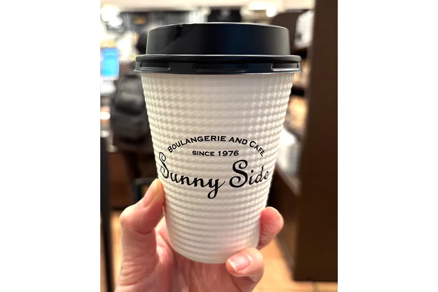 3個目は「ブレンドコーヒー」。実は、『できるだけ、焼き立てのパンをコーヒーと共に味わってもらいたい』との考えから各店舗にカフェスペースを設けている「サニーサイド」。「サニーサイド吹田南千里本店」も同じで、購入したパンやドリンクを店内のカフェスペースでいただくことができる。サニーサイド吹田南千里本店」にも20席ほどあり(テラス席も別途あり)、おひとりさまでの食事や子ども連れのママの休憩など、取材時も幅広い層の人が日常的に利用しているのが見えた。