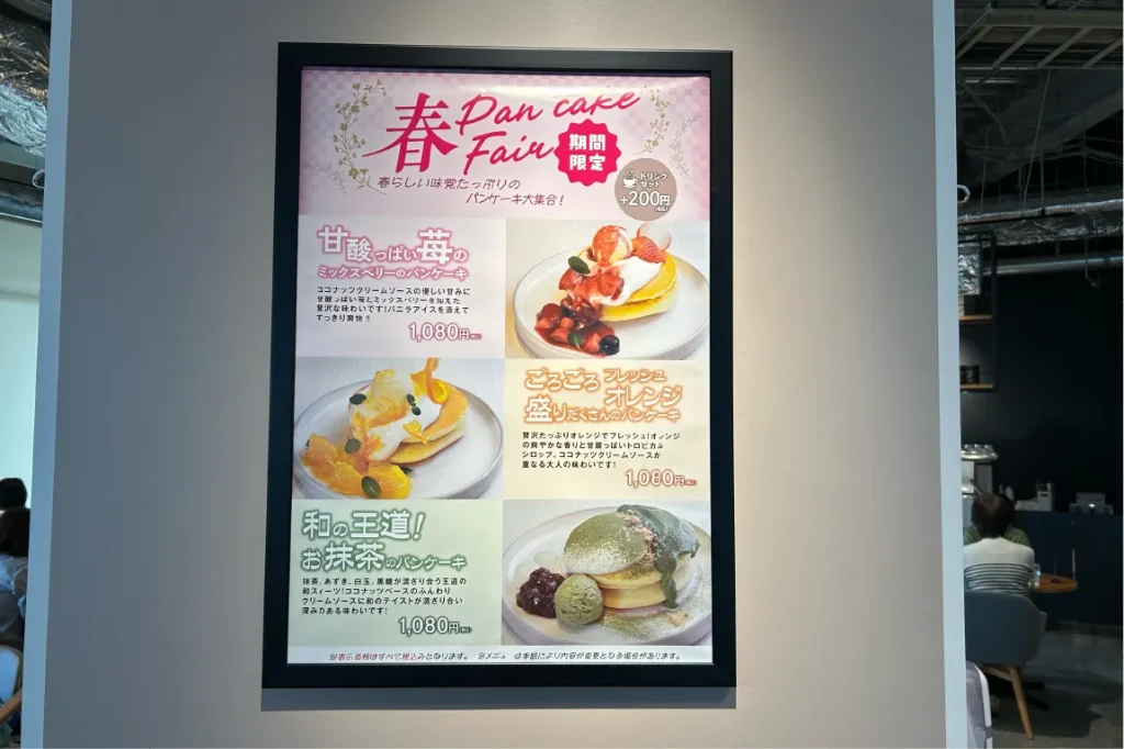 4月からは、『春のパンケーキフェア』と題して3種のフレーバーでのメニューが登場。バター風味のパンケーキをベースに季節の果実などがもりだくさんで、どれにしようか迷うこと請け合いです。