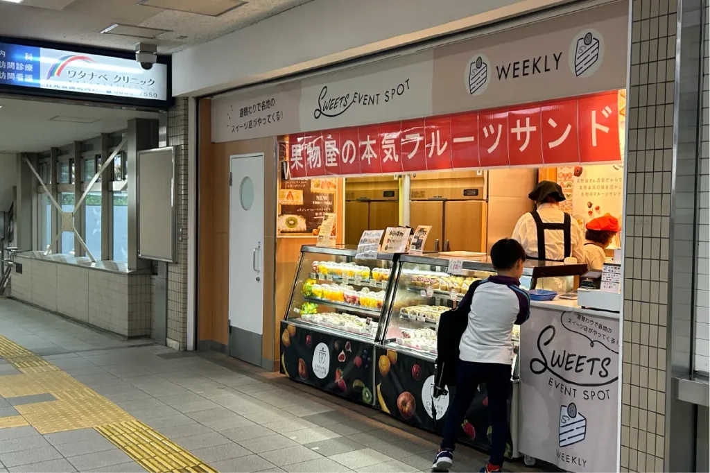 こちらの特徴は、何といっても週替わりで各地の人気スイーツ店が出店すること。訪れたこの日のショップは、「イチバンヤフルーツカフェ」がお目見えしていました。阪急大阪梅田駅の2階中央改札前にもショップを構える人気店ですが、このタイミングなら地元・吹田市でも味わえるとあって、のぞいてみることに。