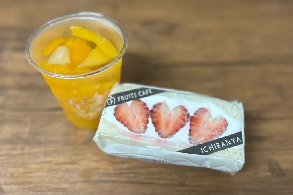 果物店が手掛けているとあって、鮮やかな果実を使ったメニューがズラリと並びます。この日にゲットしたのは奈良県産の高級いちご・古都華のフルーツサンドと柑橘類たっぷりのゼリー。軽やかな生クリームが甘酸っぱい古都華の味わいを引き立てるサンド、ゼリーはフレッシュな果実感がジューシーで、ペロリといただいてしまいました。